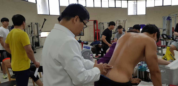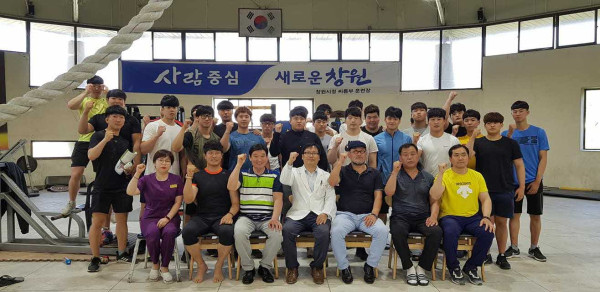 용마고씨름부, 경남대학교씨름부,창원시씨름단일반부 선수들에게 의료봉사를 실시하고 기념촬영을 하였습니다.